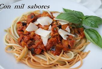 Ya os dije que el violeta sería mi color esta temporada y nuevamente os traigo una receta con berenjenas. Yo creo que solo me ha faltado incorporarlas al Roscón de Reyes!!!, pero mira que están ricas las jodías!. La pasta también es otra de mis debilidades, seguro que tengo raíces Italianas.bueno...raíces no sé, pero ramas me van a salir seguro como a mi planta de albahaca pues le estoy sacando muchísimo provecho también. Bueno, que como hay que recuperar fuerzas después del largo fin de semana, aquí os dejo esta receta que seguro os va a encantar.Ingredientes:Unos 350 gr. de pasta (Yo espaguetis).