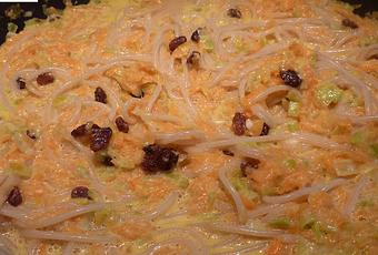 Picamos el puerro y lo ponemos a pochar en una sartén, cuando esté cocinado, añadimos la calabaza rayada. Damos unas vueltas e incorporamos la leche de coco junto con un puñado de pasas.