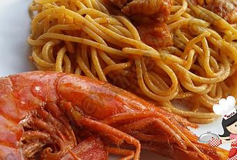 - Despresuriza, abre la olla, escurre los espaguetis y en la cubeta sin lavarla, agrega los gambones con los ajos, el aceite y los espaguetis escurridos, ve removiendo y mezclando, que se vayan salteando. Ná, con un minutillo es suficiente.