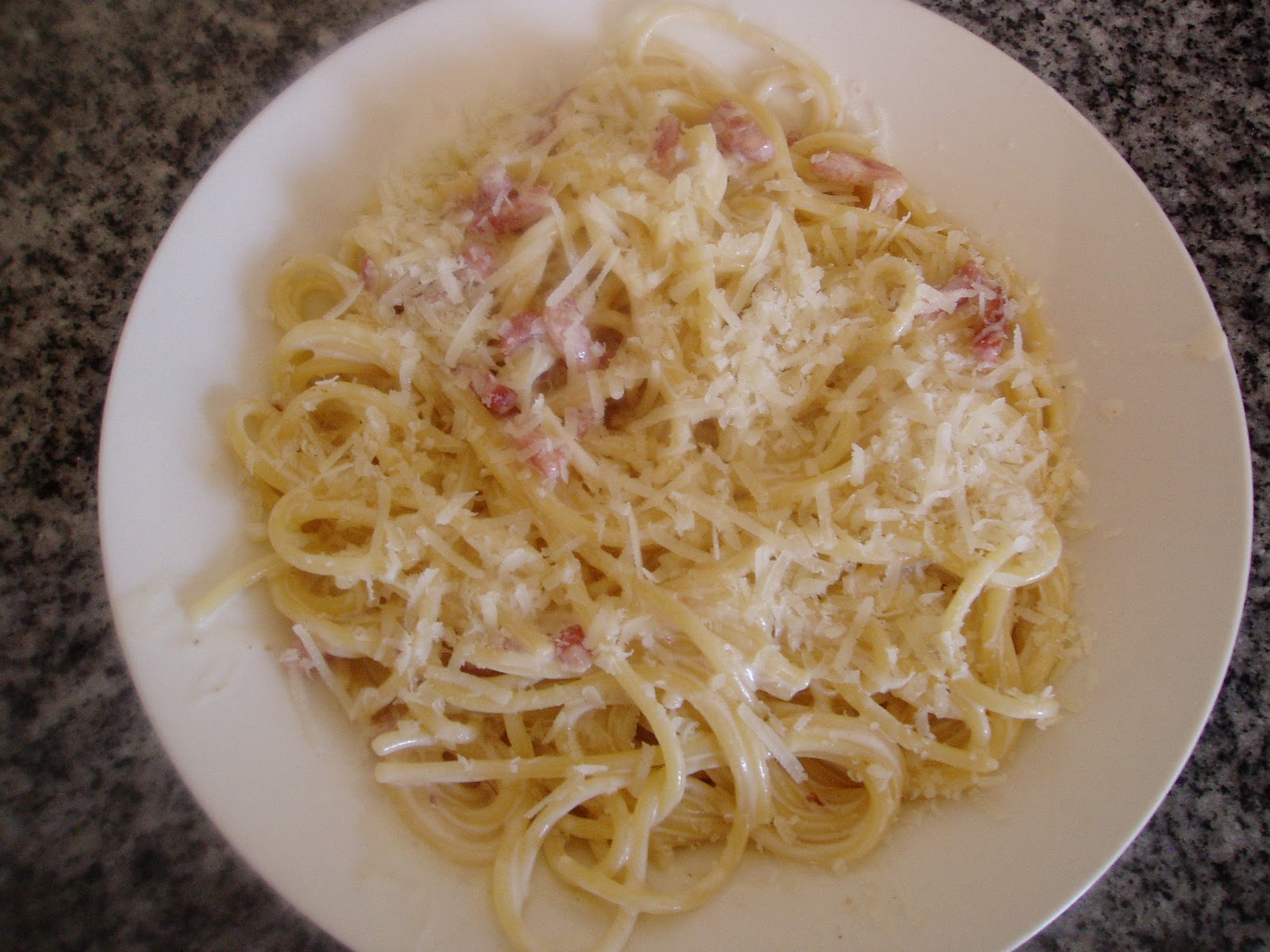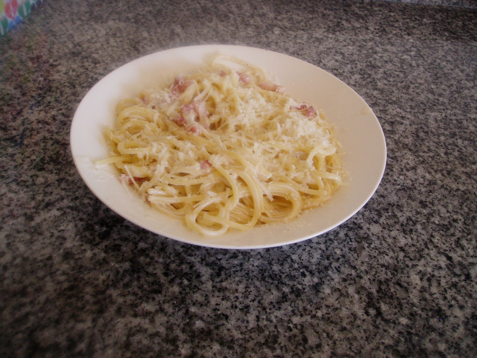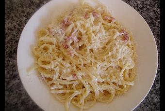Ingredientes:Espagueti1 Tetrabrik de nata para cocinarSalPimienta negra1 Pastilla de avecremAguaBacónQueso parmesanoAceite de oliva