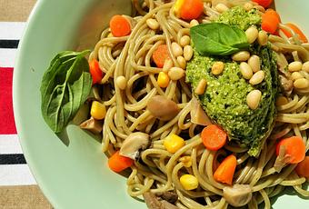 - Servimos los espaguetis con la salsa pesto. Podemos servirlos tanto como plato principal, como una guarnición con unas albóndigas vegetales, hamburguesas, etc.