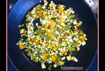 En una tabla, troceamos menudito el pimiento, la cebolla, el calabacín y la zanahoria. Echar en una sartén con un chorrito de aceite y sofreír a fuego lento.
