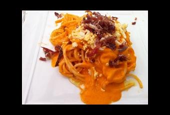 Es un buen plato para todavía lo que queda de verano. Espaguetis con salsa de salmorejo.