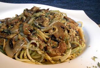 Mientras tanto, cocer los espaguetis en agua hirviendo con sal. Una vez cocidos, escurrir y mezclar con las setas.Añadir el orégano, el tomillo, el perejil picados y espolvorear un poco de pimienta molida. Mezclar y rociar con el aceite sobrante.Servir seguidamente.