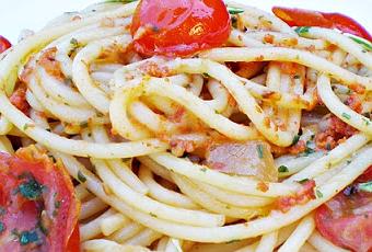 Ingredientes para 4 personas: 350 – 400 gr. pasta fresca de espaguetis 1 cebolla 2 latas de anchoas (120gr x2) 200 gr. de tomates cherry 1 lata de huevas de erizo perejil, romero fresco aceite de oliva virgen extra