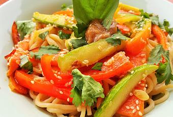 ♥ 250g de espaguetis o fideos♥ 1 pimiento rojo♥ 2 calabacines♥ 1 zanahoria♥ semillas de sésamo♥ cilantro♥ pimienta♥ salPara la salsa:♥ 120 g de crema de cacahuetes♥ 60 ml de agua♥ 3 cdas de salsa de soja♥ 1-2 cdas de azúcar integral♥ 1/2-1/4 pimienta cayena (opcional)♥ 2 cdas de zumo de limón♥ 1 cm de jengibre fresco rallado♥ 2 dientes de ajo♥ aceite vegetal