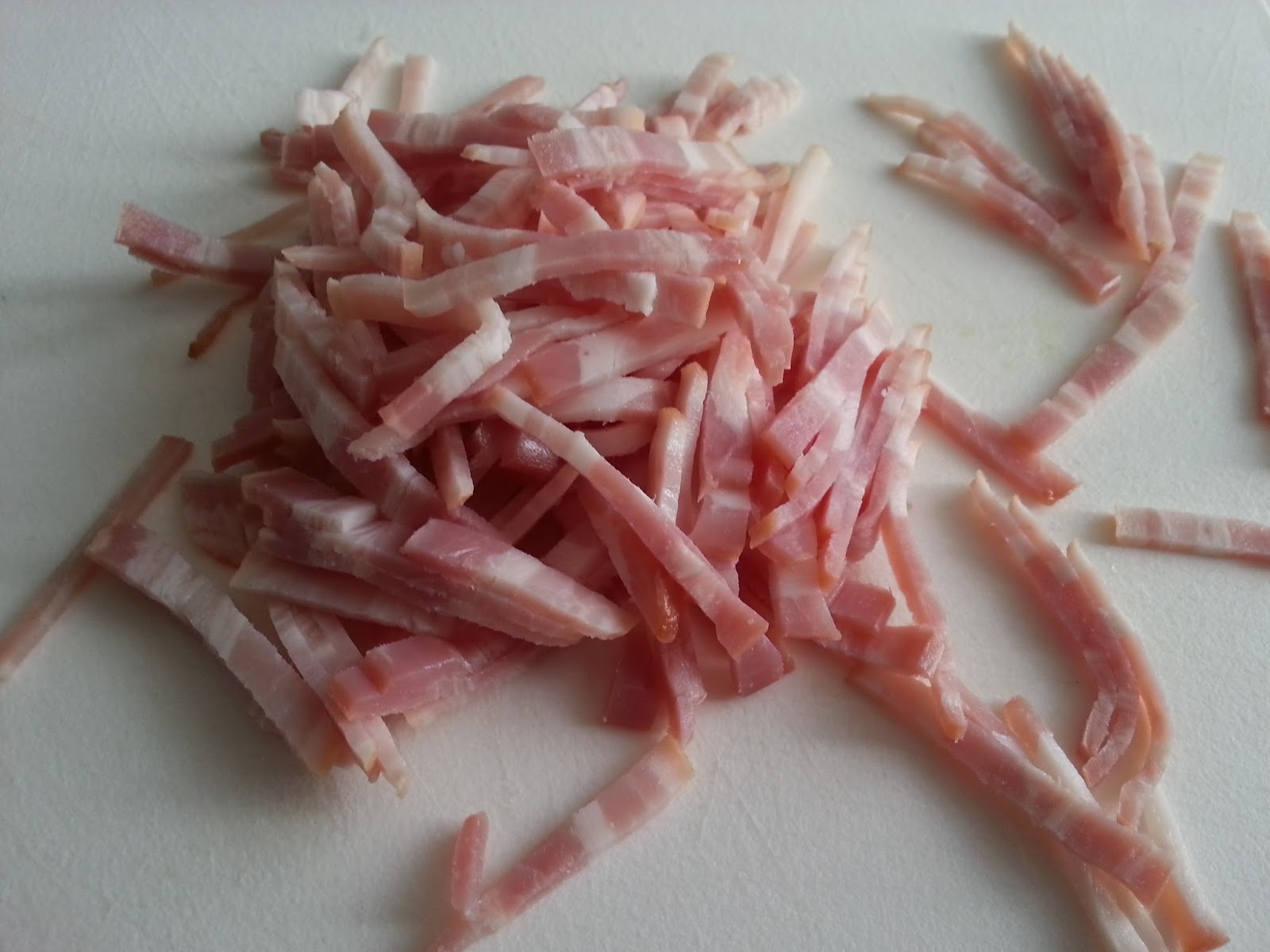 2. - Mientras se dora, cortamos el bacon en finísimas tiras y reservamos.
