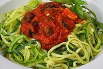 Servir los espaguetis de calabacín al dente con la salsa por encima.