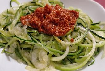 1 cucharada de aceto balsámico de MódenaElaboración:Los espaguetis de calabacín se pueden cocinar salteándolos en una sartén durante 2 minutos o dejarlos en remojo con agua caliente 1 minutos, para que queden crujientes. Colar y reservar.Desmigar en tiras o trozos no muy grandes el bacalao desalado.Mezclar los espaguetis con el bacalao y un ligero hilo de aceite. Sazonar al gusto.Presentar el plato con el pesto por encima de los espaguetis. Para la preparación de la salsa de pesto rojo:Si no encontramos tomates en aceite, utilizar tomates secos, se pueden poner a hidratar para que se ablanden en agua templada, escurrir bien y secar con papel absorbente. Y se introducen en un envase con aceite de oliva. Tapar el envase y dejar macerar 24 horas.Escurrir los tomates del aceiteDorar los piñones en una sartén ligeramente.Lavar las hojas de albahaca, quitar los tallos.Se puede hacer la salsa en el mortero a la italiana o bien triturar eléctricamente.Poner en el mortero los ajos pelados con una pizca de sal y majar. Añadir los piñones, los tomates, las hojas de albahaca, el aceto de Módena, unas gotas de limón o lima y majar la mezcla. Ir añadiendo poco a poco el aceite de oliva, se puede utilizar el mismo aceite de conserva de los tomates, hasta que quede una salsa fina. Por último, añadir el queso parmesano rallado y mezclar. Rectificar de sal, si es necesario. Si se prepara en la batidora eléctrica, picar antes las hojas de albahaca y añadir todos los ingredientes juntos. (Hacerlo así es más rápido)Dejar reposar en la nevera, mejor toda la noche, para potenciar su sabor. Es una salsa que se puede guardar hasta diez días en la nevera.