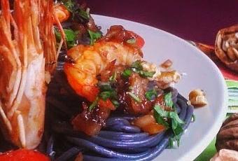 Espaguetis hechos con tinta de sepia y cocinados con gambones, nueces, tomates cherry y Vermut Rojo.El Vermut dulce es ideal para guisos de pollos, salsa y marinados.