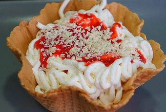 Con ayuda de una batidora monte la nata y una vez ya montada rellene con ella una manga pastelera. Ralle el chocolate blanco con ayuda de un rallador. A continuación eche una bola del helado de vainilla en la tulipa para helados. Corte un orificio en la manga pastelera de un tamaño bastante pequeño para que la nata salga de forma muy fina como si fuese un espagueti, y vaya echándola sobre el helado de vainilla hasta que la tulipa este llena de espaguetis helados. Vierta un poco de coulis de fresas por encima de forma que simule la salsa de tomate y para acabar eche ralladura de chocolate blanco por encima que le dará ese aspecto de queso rallado. Sirva rápido los espaguetis helados para evitar que se derrita el helado.