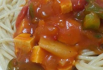 4/5 filetitos de tofu bbq (en daditos)2 vasos de salsa de tomate frito (casero a poder ser)verduras picadas al gusto (pimiento verde,cebolla, champiñón, calabacín...)pizca de sal marinapizca de romero secoCocemos la pasta según indicaciones del paquete, por otro lado hacemos un sofrito con las verduritas que irán en la salsa, añadimos la sal, el romero, el tofu en daditos rehogamos hasta dorar el tofu y añadimos el tomate , mezclamos bien y servimos encima de la pasta.