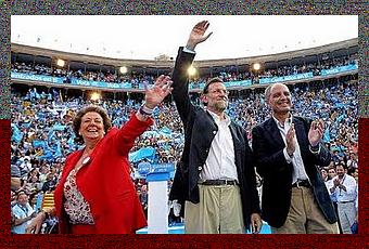 En la imagen que ilustra el post, Mariano Rajoy, líder del PP, saluda en un mitin entre Rita Barberá, la alcaldesa de Valencia que según grabaciones policiales exigía a Gürtel bolsos de marca Louis Vuitton como regalo, y el presidente de la Generalitat Valenciana, Francisco Camps, alias El Curita dentro de la mayor red de corrupción de la historia de España.