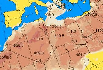 Concentración de polvo (µg/m3) prevista por el modelo SKIRON para 20-mayo-2016. ©Universidad de Atenas.El pronóstico generado por Barcelona Dust Forecast Center puede verse aquí
