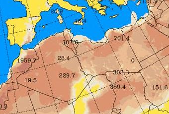Concentración de polvo (µg/m3) prevista por el modelo SKIRON para 26-mayo-2016. ©Universidad de Atenas.El pronóstico generado por Barcelona Dust Forecast Center puede verse aquí.