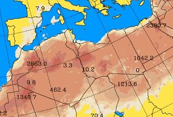 Concentración de polvo (µg/m3) prevista por el modelo SKIRON. ©Universidad de Atenas.