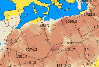 Concentración de polvo (µg/m3) prevista por el modelo SKIRON para 10-abril-2017. ©Universidad de Atenas.