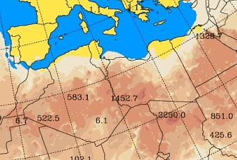 Concentración de polvo (µg/m3) prevista por el modelo SKIRON para 10-diciembre-2016. ©Universidad de Atenas.