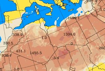 Concentración de polvo (µg/m3) prevista por el modelo SKIRON para 11-abril-2017. ©Universidad de Atenas.