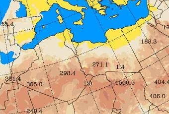 Concentración de polvo (µg/m3) prevista por el modelo SKIRON para 12-diciembre-2016. ©Universidad de Atenas.