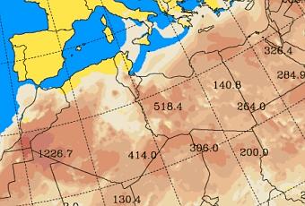 Concentración de polvo (µg/m3) prevista por el modelo SKIRON para 12-enero-2017. ©Universidad de Atenas.