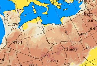 Concentración de polvo (µg/m3) prevista por el modelo SKIRON para 14-abril-2017. ©Universidad de Atenas.