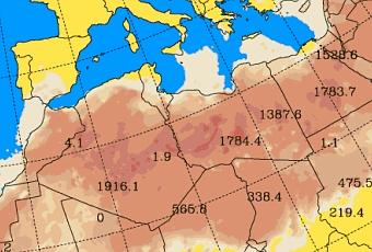 Concentración de polvo (µg/m3) prevista por el modelo SKIRON. ©Universidad de Atenas
