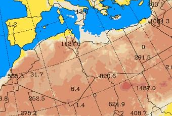 Concentración de polvo (µg/m3) prevista por el modelo SKIRON para 1-abril-2017. ©Universidad de Atenas.