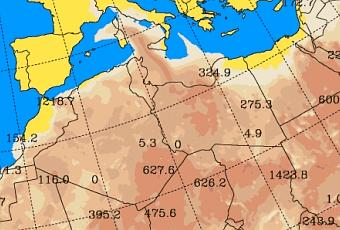 Concentración de polvo (µg/m3) prevista por el modelo SKIRON para 21-diciembre-2016. ©Universidad de Atenas.