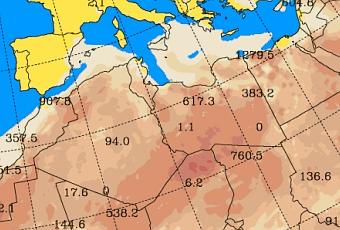 Concentración de polvo (µg/m3) prevista por el modelo SKIRON para 22-marzo-2017. ©Universidad de Atenas.