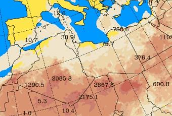 Concentración de polvo (µg/m3) prevista por el modelo SKIRON para 24-diciembre-2016. ©Universidad de Atenas.