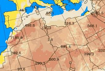 Concentración de polvo (µg/m3) prevista por el modelo SKIRON para 24-octubre-2016. ©Universidad de Atenas.