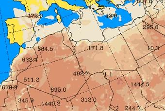Concentración de polvo (µg/m3) prevista por el modelo SKIRON para 27-marzo-2017. ©Universidad de Atenas.
