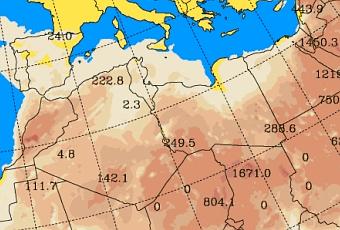 Concentración de polvo (µg/m3) prevista por el modelo SKIRON para 3-diciembre-2016. ©Universidad de Atenas.