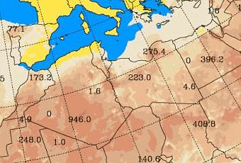 Concentración de polvo (µg/m3) prevista por el modelo SKIRON para 30-octubre-2016. ©Universidad de Atenas.