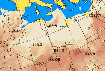 Concentración de polvo (µg/m3) prevista por el modelo SKIRON para 4-enero-2017. ©Universidad de Atenas.