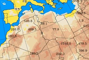 Concentración de polvo (µg/m3) prevista por el modelo SKIRON para 5-diciembre-2016. ©Universidad de Atenas.