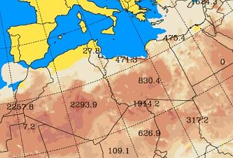 Concentración de polvo (µg/m3) prevista por el modelo SKIRON. ©Universidad de Atenas.