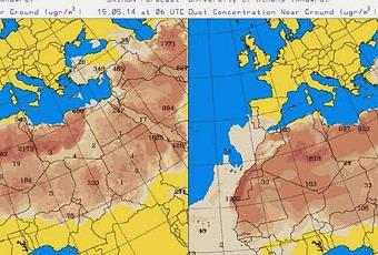 Las concentraciones de polvo a nivel de superficie en el Sur y zonas del centro peninsular podrían alcanzar valores de entre 20 y 25 µg/m3. Se prevé que en estas áreas además pueda tener lugar deposición seca de polvo.