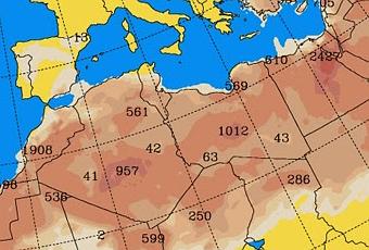 Concentración de polvo (µg/m3) prevista por el modelo SKIRON para el 4 de septiembre de 2014 a las 12:00 UTC. ©Universidad de Atenas.