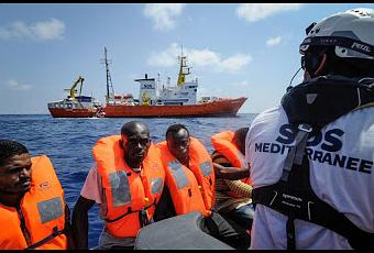 Inmigrantes rescatados llevados abordo del barco de rescate Aquarius.