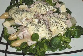 Es muy fácil de preparar y apenas necesita explicación pero os digo como he montado el plato. En el fondo los canónigos y encima cuatro espárragos. Encima ponemos las lonchas de pavo cortadas en trozos pequeños y el queso también. Ahora, secamos los pepinillos con un papel absorbente de cocina y en la tabla de madera los picamos bien bien hasta dejarlo picado muy fino. Los incorporamos al cuenco donde tengamos la mayonesa y lo movemos bien. Ponemos la mayonesa encima del pavo y el queso y espolvoreamos con semillas de amapola. No es un primer plato o entrante riquísimo?