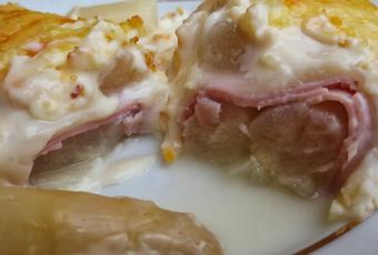 1- Engrasar una fuente con un poco de aceite, poner una capa de espárragos bien escurridos, tapar con 4 lonchas de jamón cocido y 2 de queso. Reservar.