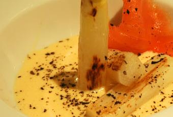ESPÁRRAGO CON MAYONESA, SALMÓN AHUMADO Y POLVO DE ALGA.