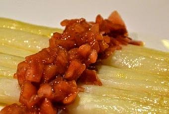 Se está acabando la temporada y no había compartido con vosotros estos Espárragos con Vinagreta de Tomate y Jamón, que son una entrada fabulosa que podéis tener preparada con antelación.