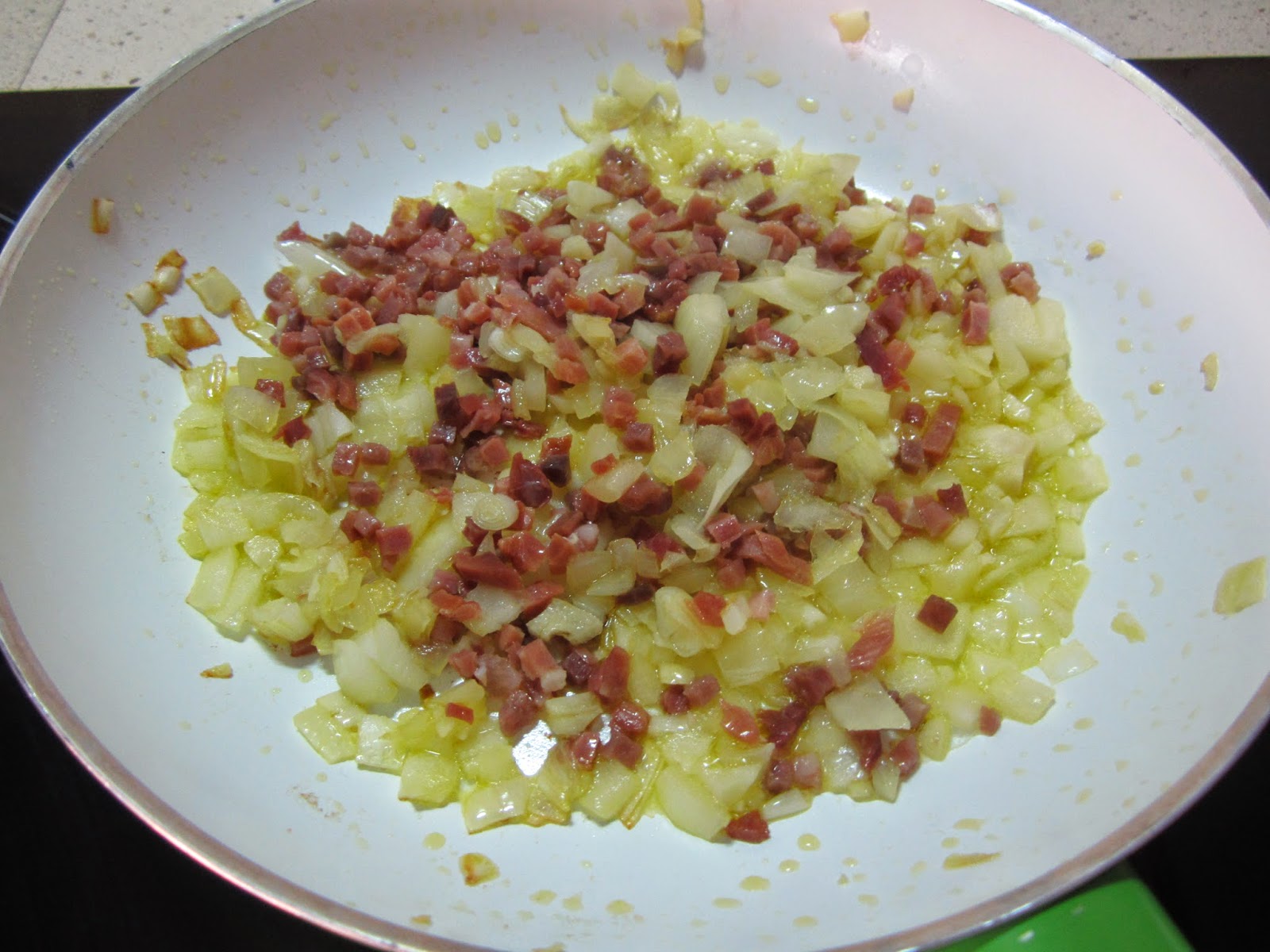 Media cebolla picada para que no se nos queme el ajo. Todo a fuego medio.