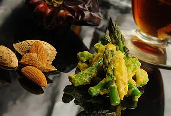 Espárragos en salsa de almendra Ingredientes: 1 kg. Espárragos trigueros de Huétor Tájar, 150 g. Almendras, 1 Pimiento choricero seco, 5 Ajos, 1 Cebolla, 1 Rodaja de pan del día anterior, 1 Vasito de vino de Montilla, Sal, Pimienta y Aceite de oliva virgen extra Hojiblanco de la Denominación de Origen Estepa Preparación: Se pone en un cazo un poco de agua para blanquear las almendras y las reservamos. Echamos en una sartén un poco de aceite de oliva virgen extra para dorar los ajos enteros y se reservan. A continuación se doran las almendras blanqueadas y las reservamos, se dora el pan, el pimiento se pasa un poco y la cebolla cortada en juliana también se dora. Lo reservamos todo.