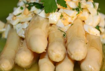 ElaboraciónHacer la vinagreta en un cuenco, mezclando el vinagre con sal y pimienta. Batir con un tenedor o varillas manuales. A continuación agregamos el aceite de oliva y el perejil picado. Seguimos batiendo hasta que quede una salsa emulsionada.Picar los huevos y añadirlos a la vinagreta anterior. Mezclar bien.Escurrir los espárragos y disponerlos en una fuente. Regarlos con la vinagreta y el huevo duro. Dejar que tomen sabor unos minutos antes de servir.