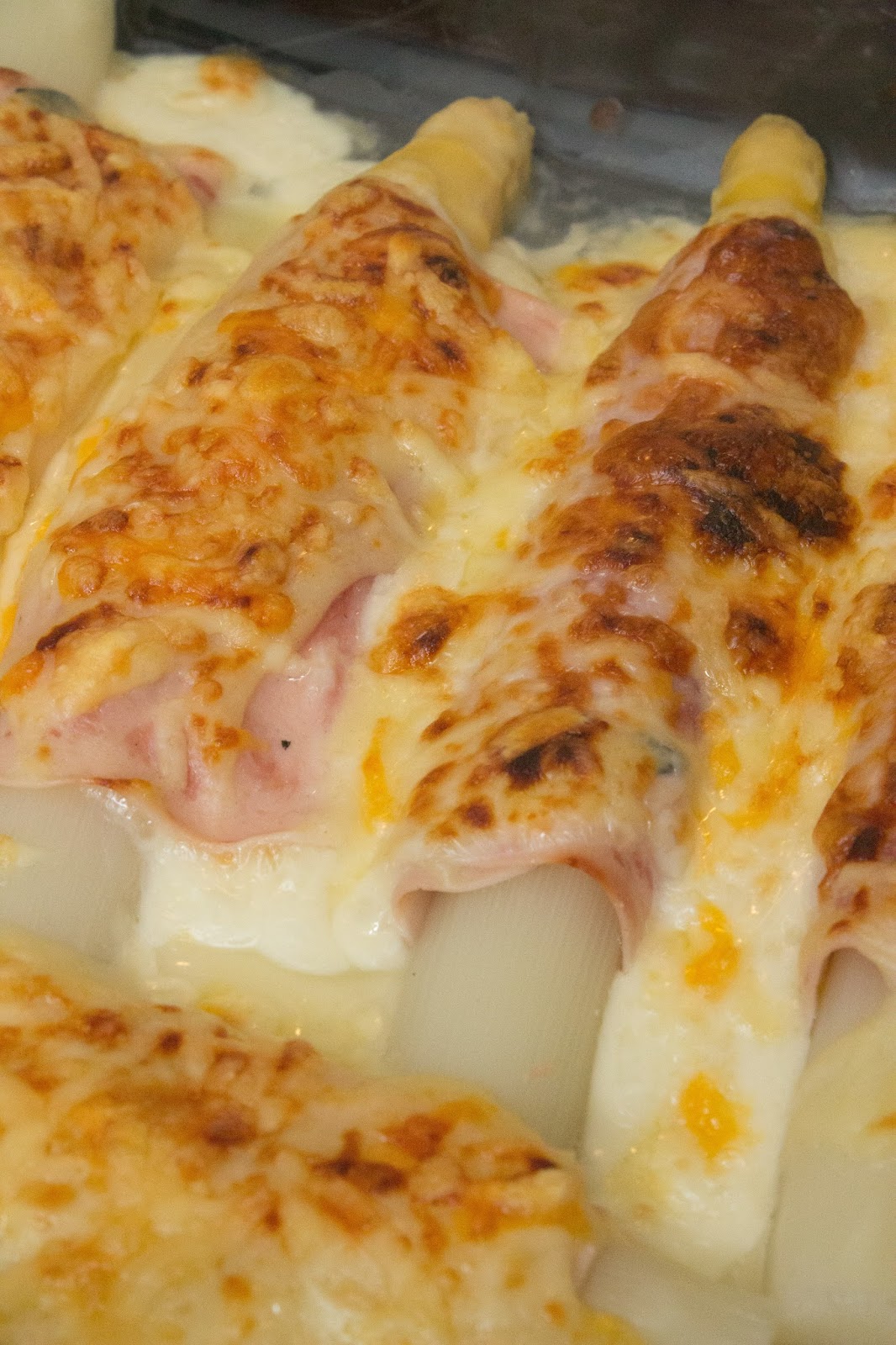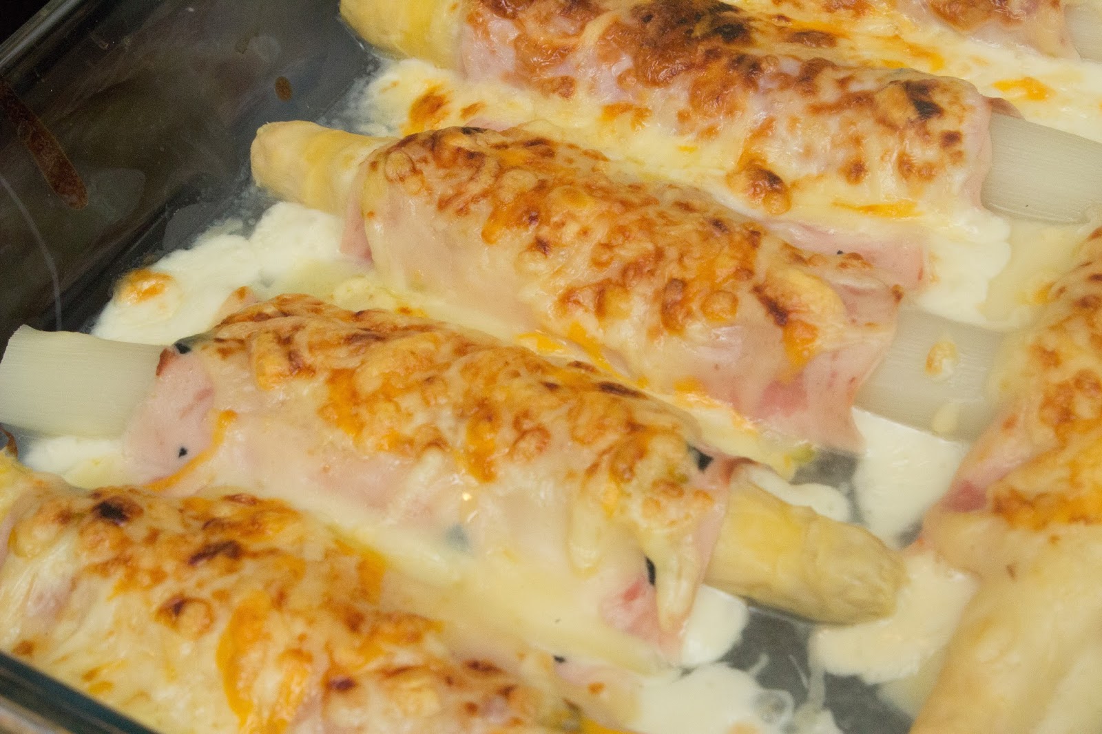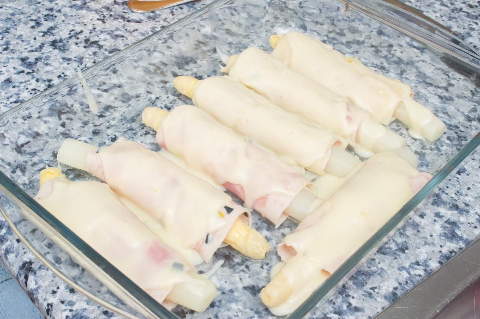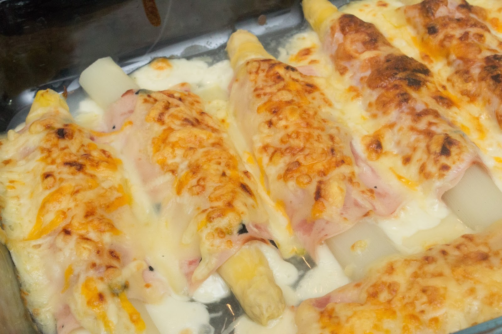 Coloca los espárragos enrollados en una bandeja de horno y cúbrelos con la bechamel por encima.