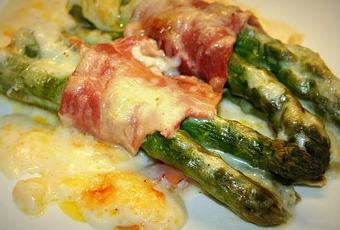 2. Hacemos manojos de 4 espárragos cada uno y los envolvemos con jamón (tal como se ve en la foto)